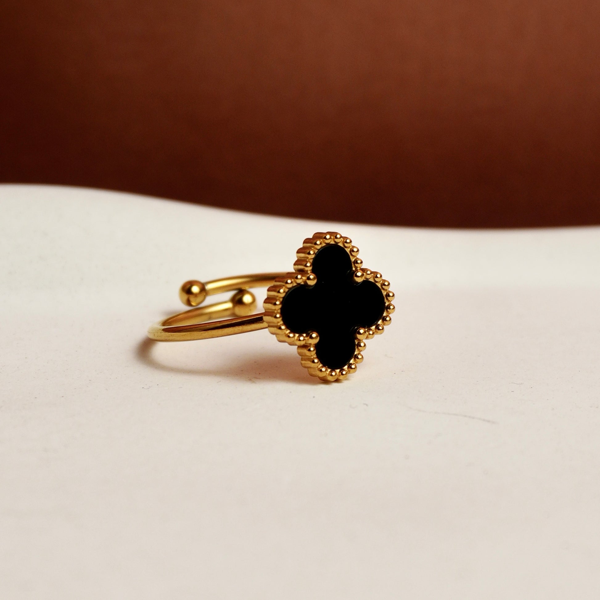 Add a touch of bold elegance with this adjustable gold-plated black clover ring, featuring a chic enamel clover design. Perfect for styling with both modern and traditional outfits, this statement ring is a versatile addition to any jewelry collection.